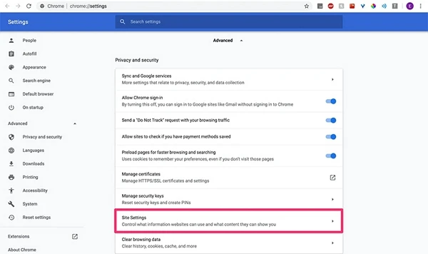 Step 2: Scroll down to the Advanced section and click on “Privacy and Security > Site Settings”.