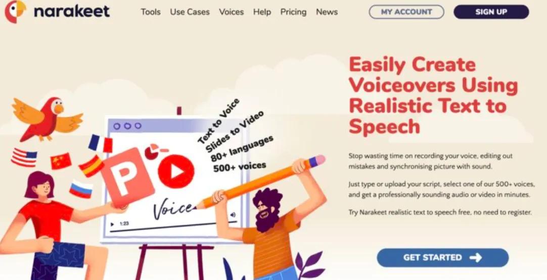If you are working internationally and require multiple languages for your project, Narakket may be the one you're looking for. It is a text-to-speech voice generator that offers 80 languages and has over 500 voices you can select from. It is widely popular among content creators that create videos by organizing still images.