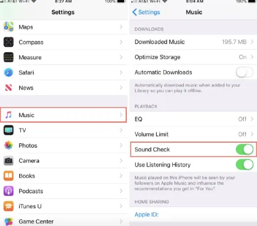 - Scroll down to the “Sound Check” toggle bar and slide it to “Off”.
