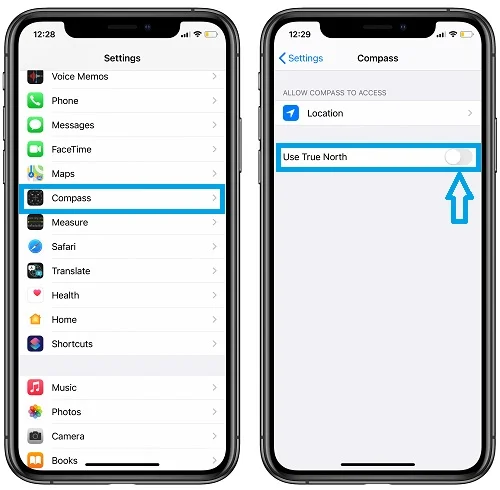 iPhone models like the iPhone 13 depend on the True North by default for all their compass readings. This could possibly be one of the things leading to your iPhone compass not working. Therefore, it may be a good idea to use the Magnetic North for some time by disabling the True North. To do this: