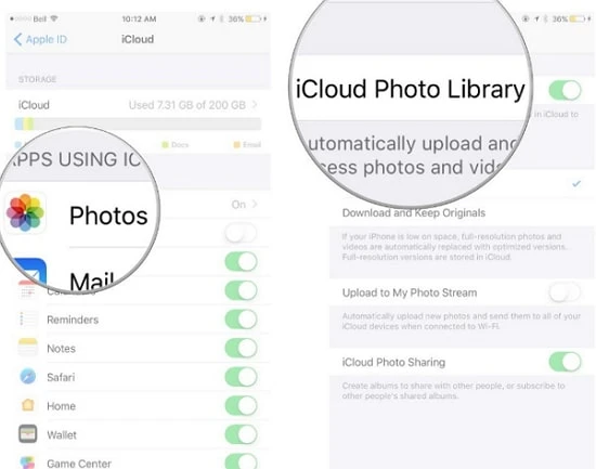 It is a little-known fact that the photos cannot be synced to iPhone if the function of ‘iCloud Photo Library’ is turned on. Thus the preparation to use this method is to go to Settings > iCloud to disable ‘iCloud Photo Library’.