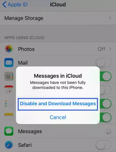 3. Disable iMessage and you will get a popup. Click on Disable and Download Messages.